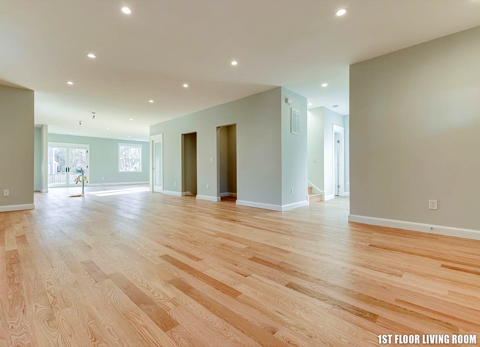 FIRST FLOOR: The first floor is open concept, spacious with a light filled kitchen, stainless steel appliances. Unique long windows located on the east side of the house between the upper and lower kitchen cabinets bring in morning sunshine. An island with seating makes a great breakfast bar or gathering space while entertaining. For those who like to entertain or have a large family, another refrigerator/freezer is in the butler’s pantry next to the dining room and a wine/beverage center is hidden behind a reclaimed wood sliding barndoor. The focal point of the living room is a remote-controlled gas fireplace. Optional built-in cabinets or shelves are available. For the busy remote worker, the first-floor bedroom may be utilized as an office with hardwired internet and cable greatly improving virtual meeting quality. For privacy and comfort of quests, a full bathroom is tucked away from the main area behind a stairway to the 2nd floor. Double glass patio doors, next to a mud room, extend the living space out to a maintenance free Trex deck and backyard.