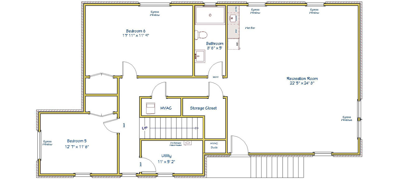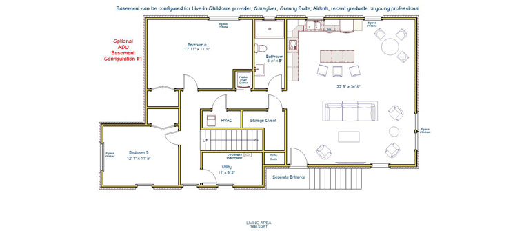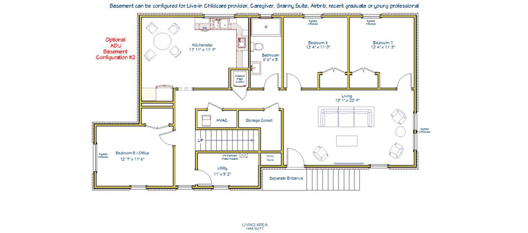 BASEMENT: The basement is not your typical basement. This space has its own entrance, two large bedrooms (or home offices) each with ample natural light and generous closet space, a full bathroom, utility room, and storage space. Finally, a huge recreation room that comes with optional wet bar and is hardwired for big screen TVs on 3 walls. The recreation room was designed with the option of being able to divide it into additional bedrooms each with their own egress windows. The basement could be configured as an Additional Dwelling Unit for caregivers, multi-generational families, live-in childcare providers, recent graduates and young professionals. See below for Optional Basement Configurations (which are not included in listing price).